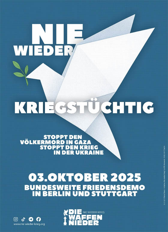 03.10.2025 (red) Die Initiative „Nie wieder Krieg – die Waffen nieder!“ ruft für den 3. Oktober gemeinsam mit Friedensorganisationen zu bundesweiten Demonstrationen an zwei Orten in Berlin und Stuttgart auf. Gegen die Hochrüstung mit ihren unsozialen Konsequenzen. Gegen die Mittelstreckenwaffen. Gegen die innere Militarisierung. Gegen die Bedrohungslüge. Für die Beendigung aller Kriege – insbesondere in der Ukraine und im Mittleren Osten / Westasien.