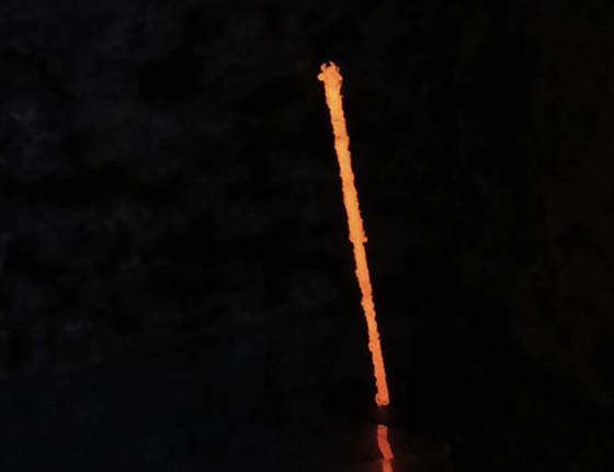 Auch Ursula Eske will mit ihrer Installation „Auf der Suche nach dem verlorenen Faden“ eine Stimmungslage aufzeigen, die jetzt sicher viele erleben. Im dunklen, nicht fassbaren Raum erzeugen leuchtende Fäden, wie Linien aus Licht, Säulen, Hochhäusern gleich. Sie geraten aber aus dem Gleichgewicht, wie Gebäude nach einem Erdbeben oder Angriff, manche scheinen den Kipppunkt vor dem endgültigen Zerfall erreicht zu haben.
