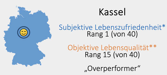 56 Prozent der Kasseler seien „hochzufrieden und lediglich 3 Prozent sind wirklich unzufrieden mit ihrem Leben“ findet sich zu Kassel weiter mitgeteilt. Bemerkenswert sei, dass die von den Kasselern „empfundene Lebenszufriedenheit“ über dem liege, was „objektive Indikatoren zur Lebensqualität vermuten lassen“. Das sei erstaunlich wird eingestanden, „denn immerhin ist jeder 7. Kasseler überschuldet oder auf Bürgergeld angewiesen.“