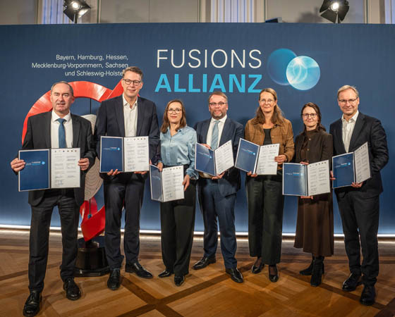 Unterzeichner der Fusionsforschungsallianz in München: Bayerns Wirtschaftsminister Hubert Aiwanger, Bayerns Wissenschaftsminister Markus Blume, Hamburgs Staatsrätin für Wissenschaft Dr. Eva Gümbel, Hessens Wissenschaftsminister Timon Gremmels, Mecklenburg-Vorpommers Wissenschaftsministerin Bettina Martin, Sachsens Staatssekretärin für Wissenschaft Prof. Dr. Heike Graßmann und Schleswig-Holsteins Staatssekretär für Wissenschaft Guido Wendt. Foto © Axel König