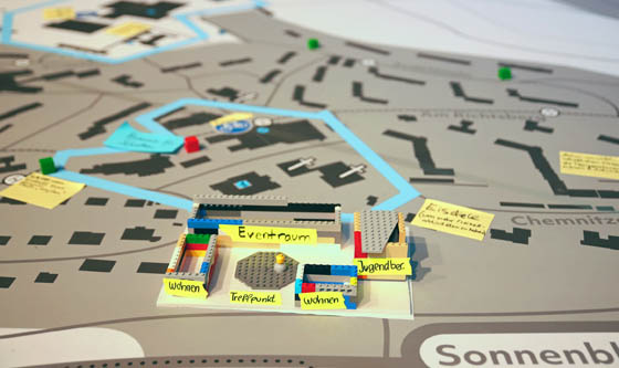 Auf einer großen Karte haben Teilnehmer Ideen für Gebiete und Räume im Stadtteil gesammelt. Visualisierungen mit kleinen Bausteinen wurden dabei platziert. Fotos Stefanie Ingwersen