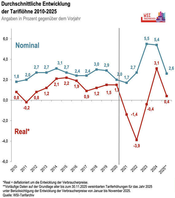 16.12.2025 (pm/red) Die Tariflöhne in Deutschland steigen im Jahr 2025 nominal gegenüber dem Vorjahr um durchschnittlich 2,6 Prozent. Bei Zunahme der Verbraucherpreise von 2,2 Prozent im Jahresdurchschnitt 2025 ergibt sich hieraus ein leichter realer Zuwachs von 0,4 Prozent. Zu diesem Ergebnis kommt das Tarifarchiv des Wirtschafts- und Sozialwissenschaftlichen Instituts (WSI) der Hans-Böckler-Stiftung in einer vorläufigen Jahresbilanz für das Tarifjahr 2025.