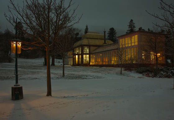 Das Gewächshaus im Bergpark Wilhelmshöhe an einem verschneiten Abend. Tagsüber ein lohnendes Ziel für einen Besuch. Foto Arno Hensmanns