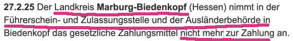 23.12.2025 (mm/red) Haben es die Bewohner mitbekommen, dass Bargeld vom Landkreis Marburg-Biedenkopf in Biedenkopf nicht mehr angenommen wird? Wie das Bildschirmfoto oben belegt, und im Blog „Geld und mehr„ veröffentlicht ist, wurde dies wirksam in der Führerschein- und Zulassungsstelle und in der Ausländerbehörde. Auch in der Oberhessischen Presse wurde am 1. März darüber berichtet.