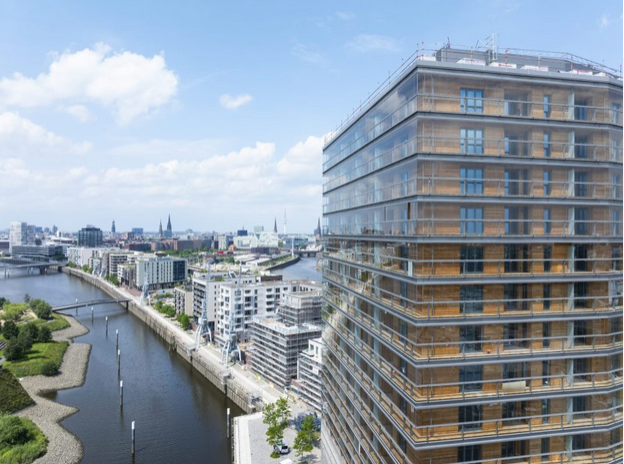 ROOTS, Deutschlands höchstes Holzhochhaus, steht für eine gelungene Verbindung aus natürlicher Ästhetik und nachhaltigem Bauen im Herzen der HafenCity. Foto (c) GARBE Urban Real Estate Germany GmbH & Co