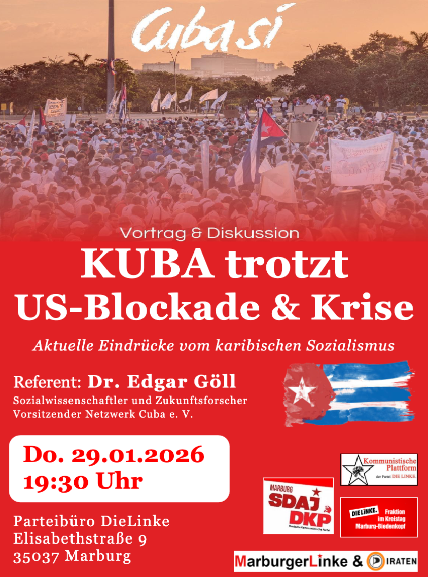 12.01.2026 (pm/red) Die CubaSí Regionalgruppe Marburg lädt ein zur Vortrags-und Diskussionsveranstaltung „KUBA trotzt der US-Blockade & Krise – Aktuelle Eindrücke vom karibischen Sozialismus“ am 29. Januar. Gemeinsam mit der DKP Marburg-Biedenkopf, der Kommunistischen Plattform (KPF), der Fraktion MarburgerLinke & Piraten und der Kreistagsfraktion Die LINKE Marburg-Biedenkopf soll in der Veranstaltung die verschärfte Blockade und Bedrohung von Kuba thematisiert werden.