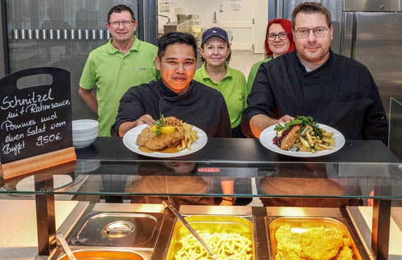 Donnerstags ist Schnitzeltag in der Kantine des Landkreises. Die Köche Antonio Apan, vorne links, und Thomas Barz, rechts, präsentieren die Variante mit Fleisch und als vegetarisches Angebot. Unterstützt werden sie im Betrieb von Klaus Hartmann, Olga Ilitschenko und Antje Huber (hintere Reihe, vl.). Das vegetarische Angebot im neuen Bistro Auszeit ist jeweils einen Euro günstiger. Foto nn, Bildquelle Landkreis