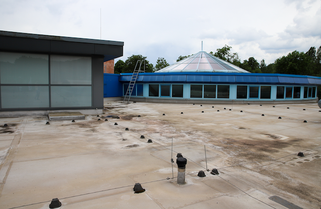 Enorme Schwachstelle: Das (Flach-)Dach des Marburger Hallenbades AquaMar. Es soll schnellstmöglich saniert werden. Foto Patricia Grähling