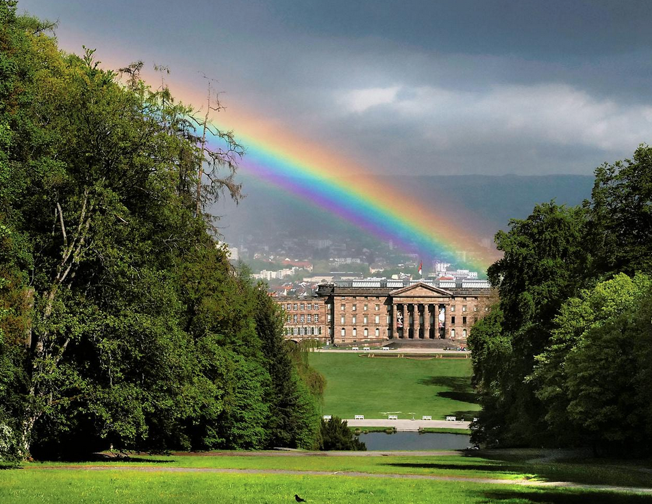 Schloss Wilhelmshöhe vom Bergpark betrachtet mit Regenbogen über den Stadtgebiet Kassel im Hintergrund. Foto Andreas Fischer
