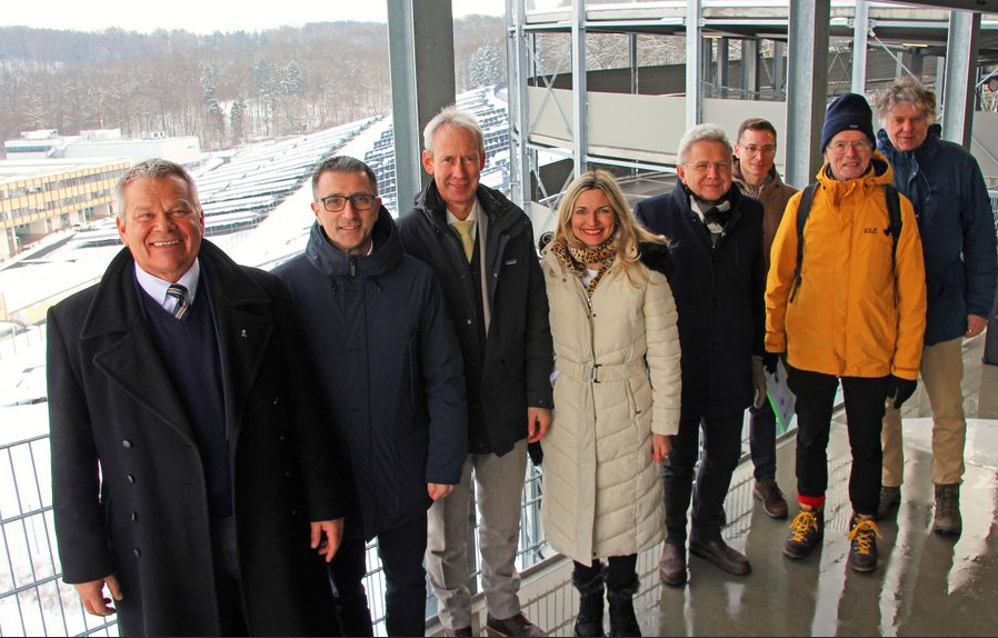 Unter grauen Himmel vor verschneiter Winterlandschaft: Oberbürgermeister Dr. Thomas Spies links, Dr. Martin Egger (Geschäftsführer von Innexis), Stadtrat Dr. Michael Kopatz, Bürgermeisterin Nadine Bernshausen, Jürgen Rausch (Geschäftsführer Gewobau), Alexander Sauer (Stadtwerke Marburg), Axel Erdmann (ehrenamtlicher Solarberater) und Stefan Schulte (Parents for Future) freuten sich gemeinsam über die Verdopplung der Solarleistung im Stadtgebiet und damit über das Erreichen des Ziels im Wattbewerb. Foto Sebastian Reichel