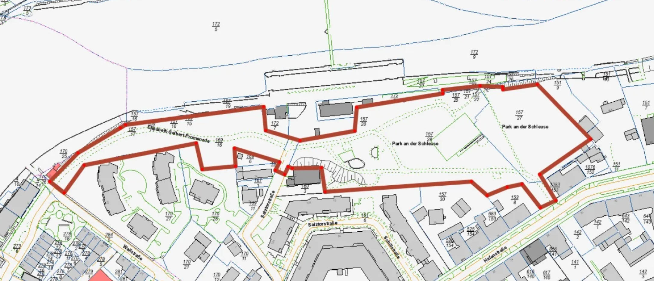 Der Parkbereich an der Kasseler Schleuse ist mit seinen zwei Hektar nicht nur der größte, sondern auch der einzige öffentliche Park in der nördlichen Unterneustadt, wird informiert. Für die Menschen, die dort leben und arbeiten, ist er ein wichtiger Freiraum. Er werde wegen der bestehenden Spiel‐ und Freizeitangebote, dem markanten Baumbestand und der Insellage geschätzt.