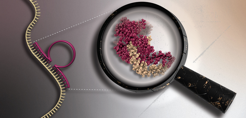 Prinzip eines DNAzyms (rot) in der Krebstherapie: Das DNAzym koppelt mit seinen Bindearmen gezielt an den RNA-Strang (gelb) einer Krebszelle und zerstört diesen, so dass die Zelle zerstört wird. Auf dieser Grundlage will das Projekt DNAmazing eine Therapie entwickeln und in klinische Studien bringen. Illustration HHU / Manuel Etzkorn