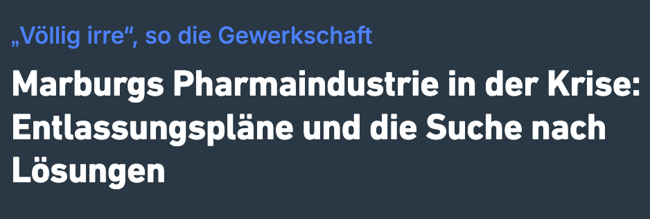 Die Oberhessische Presse (OP) titelte am 5. Februar online irreführend und fehldeutend: „Marburger Pharmaindustrie in der Krise“. Zutreffend müsste formuliert werden „Massenentlassung trotz sehr hoher Gewinne“. Eine Krise bricht lediglich für entlassene Mitarbeiter und deren Familien aus, keinesfalls ist der Konzern mit seiner Marburger Dependence in einer Umsatz- oder Gewinnkrise.