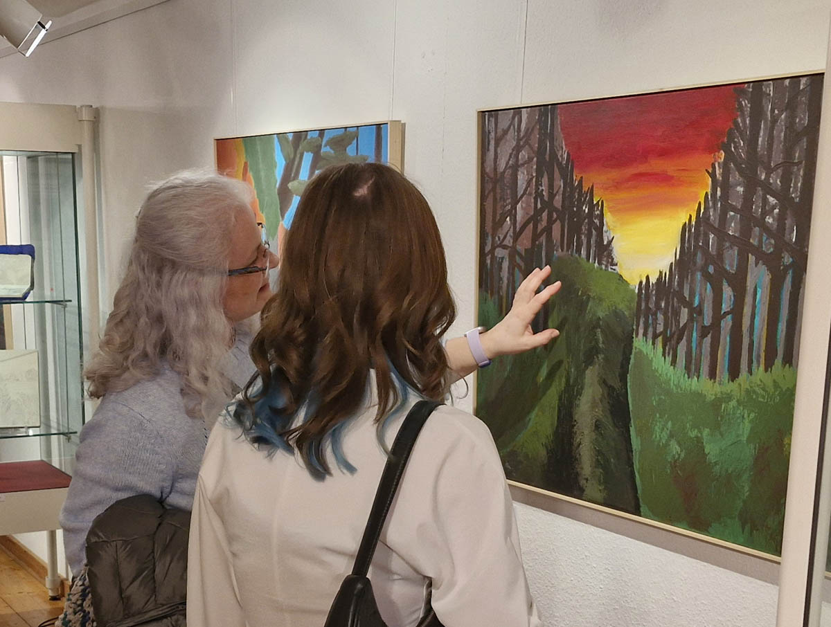 Der Galerieraum des Museums füllte sich dann schnell, Raum für lebhafte Gespräche. Besucher hatten die unmittelbar Gelegenheit, mit den jeweiligen AutorInnen über ihr Bild zu reden. Das wurde rege genutzt. Das hohe Reflexionsniveau und Selbstbewusstsein überzeugte und führte sogar zu einer ersten konkreten Kaufanfrage.