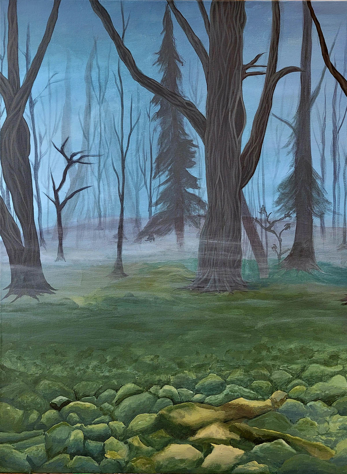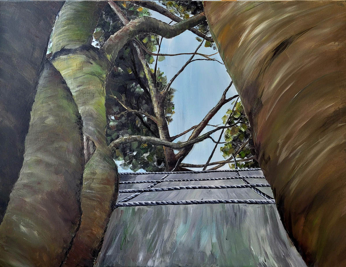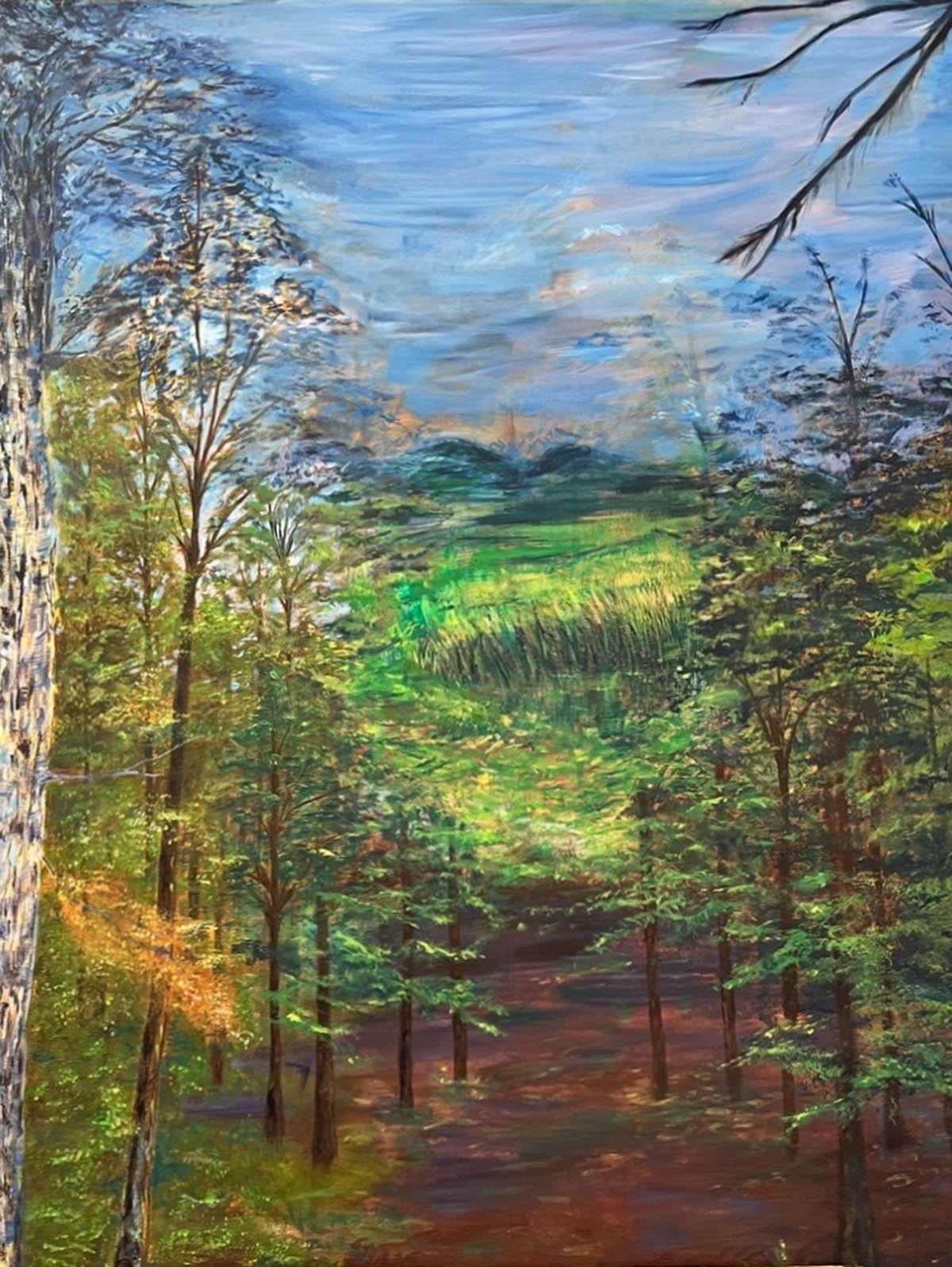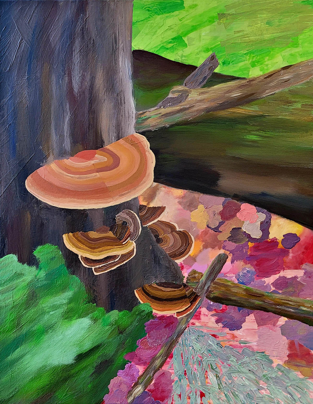 Das Malen selbst, das zunächst mit einer flächigen Untermalung von möglichen Gegenstände wie Baum, Strauch, Pilz, Steine auf der Leinwand begann, war in diesem Format: 70 x 100cm wiederum eine neue und besondere Herausforderung. Es begann eine zunehmend komplexe dialogische Auseinandersetzung mit dem was auf der Leinwand mit Farbe und Pinsel entsteht/entstanden war und der gegenstandsorientierten Vorstellung. Hier war immer wieder neu der Mut gefragt, zu ungewohnten Lösungen zu stehen, künstlerischen Entscheidungen gegenüber klischeehaften Vorstellungen den Vorrang zu geben.