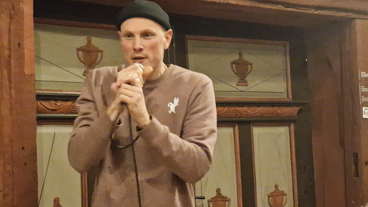 Die Veranstaltung begann musikalisch mit dem Rapper „Der beste Beckar“, den die Schülerinnen eingeladen hatten. Nach einem ersten eigenen Rapp ließ er sich vom Publikum Stichworte zur Ausstellung auf große Papiere schreiben. Es hielt dann die Worte und Sätze über ihre Köpfe, was wie eine große Demonstration aussah. „Der beste Beckar“ verwandelte sie dann spontan in einen spannenden und amüsanten Rapp. Was für eine „Einführung“!