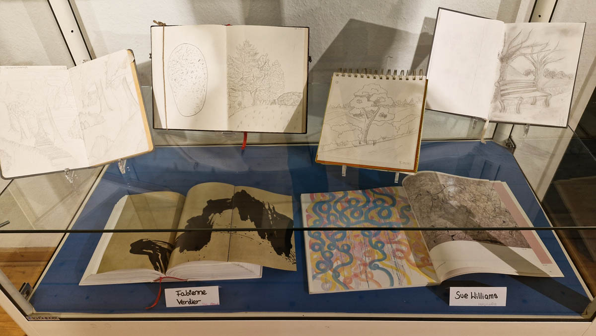 Die Arbeit begann mit einer zeichnerischen Auseinandersetzung vor Ort. In den in Vitrinen ausgestellten Zeichenbüchern kann man beobachten, wie die Schülerinnen sich in der Darstellung von Körperlichkeit, Räumlichkeit und Proportion versuchen. Wie sie eine künstlerische Form für die vielen einzelnen Formen landschaftlicher Erscheinungen finden und zu einem Bildganzen zusammenfassen. Schon hier begreifen sie, das die Zeichnung kein Abbild sondern eine Erfindung, Setzung und Ausgestaltung durch den Beobachter ist.