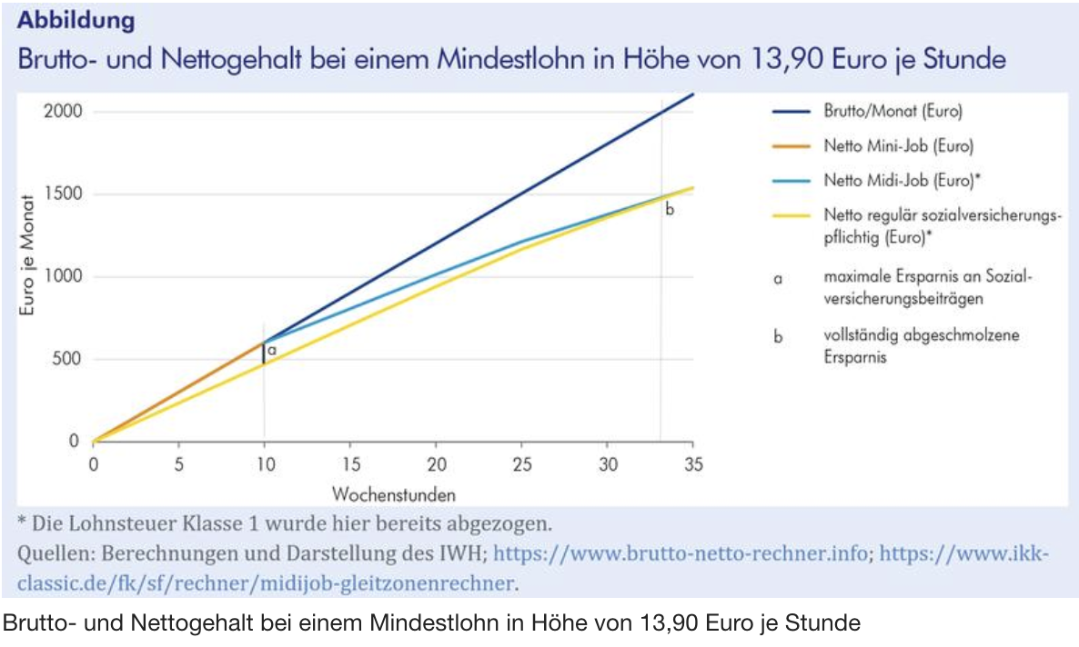 Wird die Grenze von 603 Euro überschritten, kann in einen Midijob (offiziell „Übergangsbereich“) gewechselt werden. Arbeitnehmer zahlen hier bis zu einem Monatsgehalt von 2.000 Euro reduzierte Beiträge zur Sozialversicherung, erwerben aber volle Ansprüche (z. B. Rente), während der Arbeitgeber reguläre Beiträge leistet. In diesem Bereich werden die 130 Euro Einsparung des Beschäftigten abgeschmolzen.