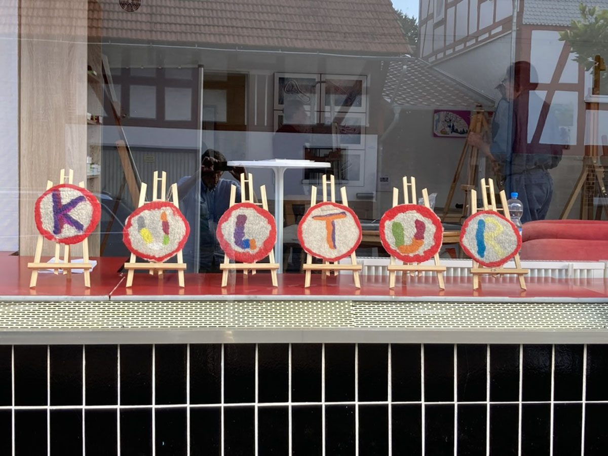 Kulturalphabet auf Staffeleien im Fenster, an den Wänden innen und als Schaufensterspiegelung in Willingshausen. Sternbald-Foto Hartwig Bambey