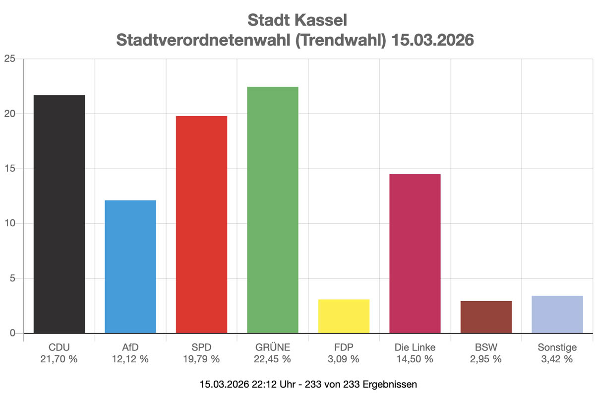 16.03.2026 (pm/red) Die Stimmzettel mit den sogenannten Listenkreuzen bei der Wahl zur Stadtverordnetenversammlung in Kassel sind ausgezählt: Insgesamt 72.277 Wähler von 142.120 Wahlberechtigten im Stadtgebiet haben sich für diese Form der Stimmabgabe entschieden. Durch das somit vorliegende Trendergebnis würde sich folgende Stimmenverteilung ergeben: